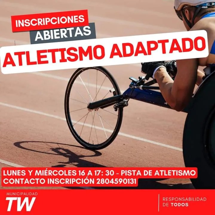Atletismo Adaptado: el espacio se desarrolla en la Pista Municipal de Atletismo, los lunes y miércoles de 16 a 17:30, a cargo del profesor Martín Bazán. Inscripciones al 2804 590131.