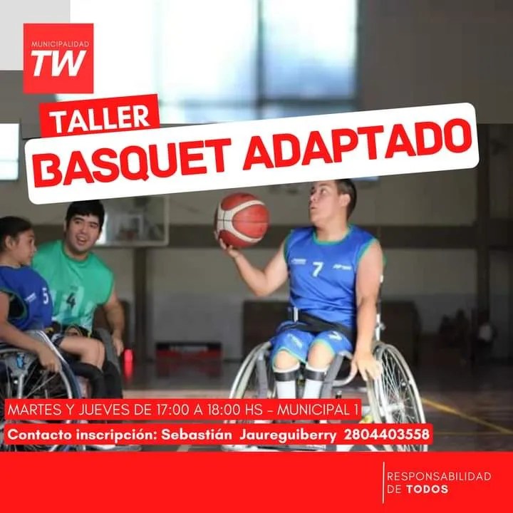Básquet adaptado: martes y jueves de 17 a 18 en el Gimnasio n.° 1, con el profesor Sebastián Jaureguiberry. Inscripciones al 2804 403558.