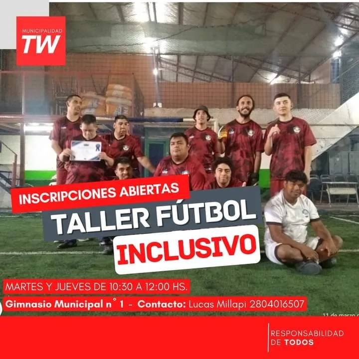 Fútbol inclusivo: martes y jueves de 10:30 a 12 en el Gimnasio Municipal n.° 1. A cargo de Lucas Millapi. Inscripciones al 2804 016507