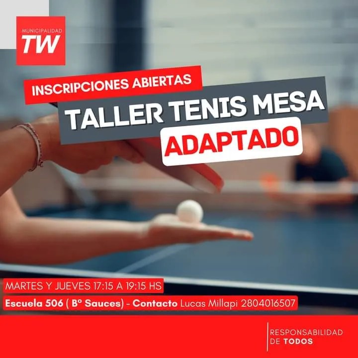 Tenis de mesa adaptado: funciona martes y jueves, de 17:30 a 19, en la Escuela N°506 del barrio Los Sauces a cargo del profesor Lucas Millapi. Inscripciones al 2804 016507.