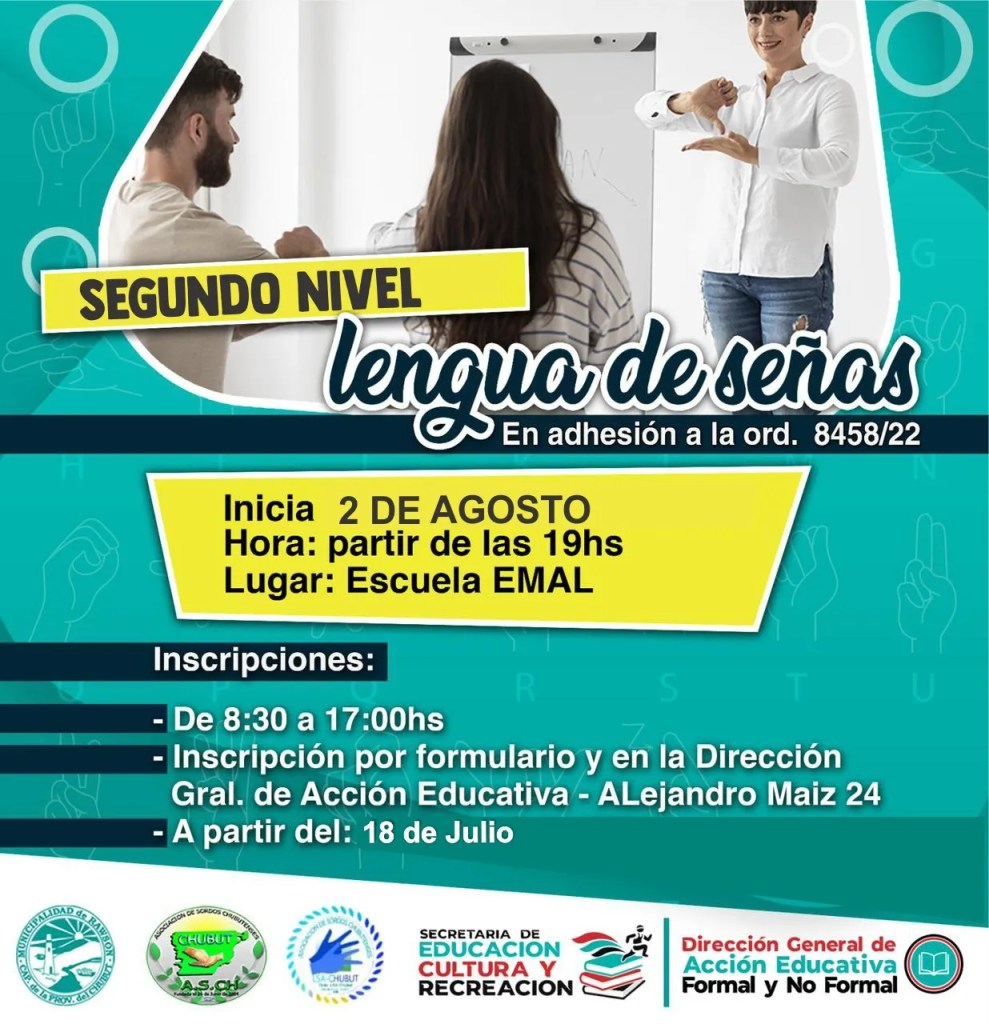 Cabe destacar que el curso de Lengua de Señas, se realiza de forma conjunta entre la Secretaría de Educación, Cultura y Recreación mediante la Dirección General de Acción Educativa Formal y No Formal municipal y la Asociación de Sordos Chubutenses.