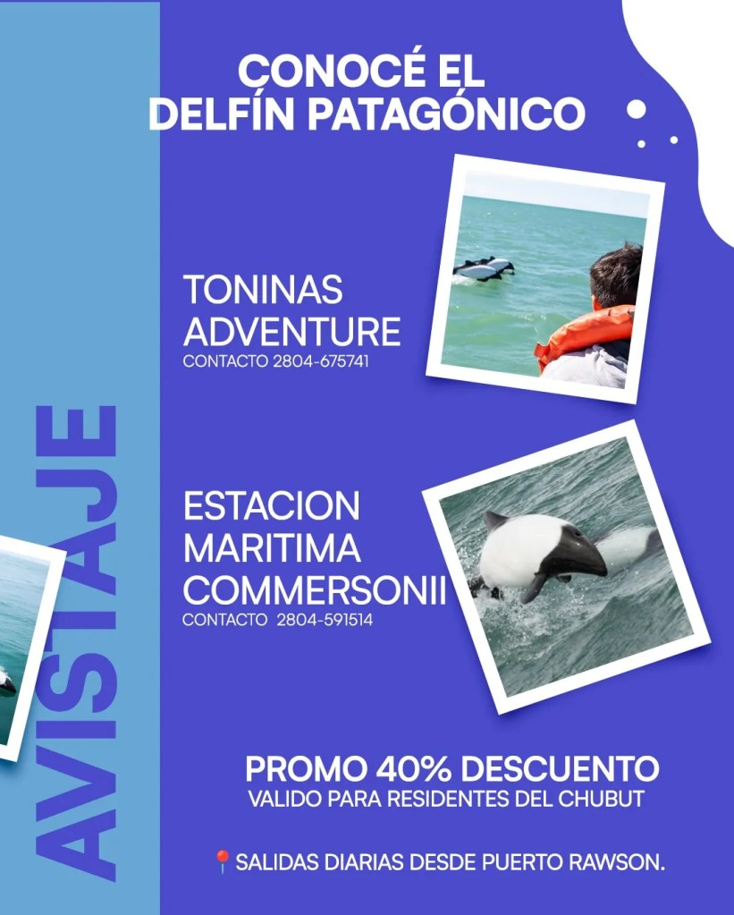Las empresas Toninas Adventure y Estación Marítima Commersonii ofrecen un 40% de descuento y válido para residentes del Chubut. Para más información, los vecinos podrán contactarse al 2804 675741 (Toninas Adventure) o al 2804 591415.