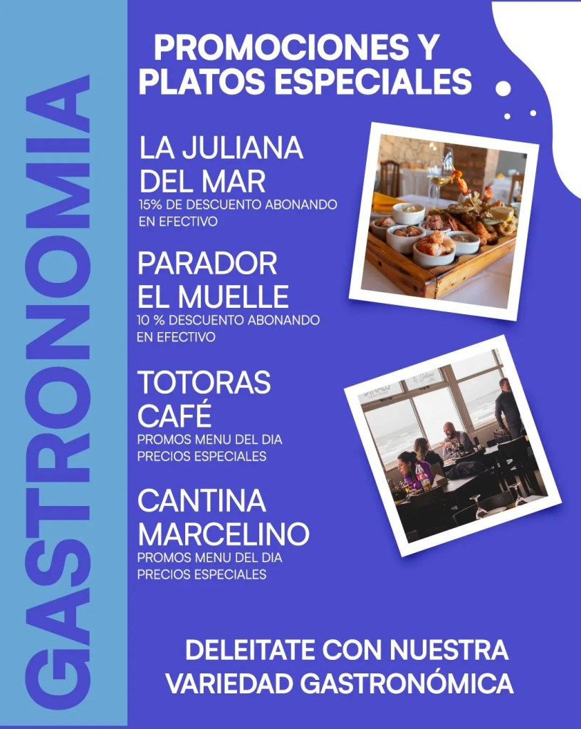La Juliana del Mar cuenta con un 15% de descuento abonando en efectivo; el Parador El Muelle con 15% de descuento abonando en efectivo. También, en Totoras Café tendrá promos y precios especiales. Por su parte, la Cantina Marcelino ofrece promos en el menú del día y precios especiales.
