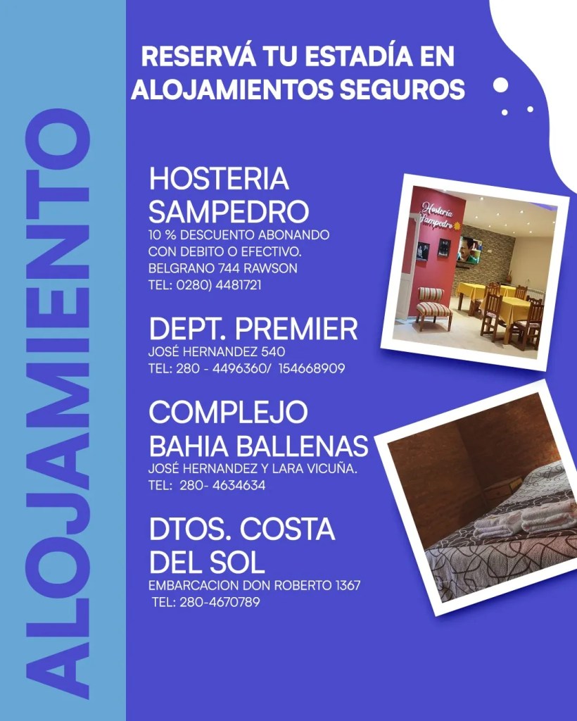 En cuanto al alojamiento, los vecinos y visitantes podrán contar con la Hostería “San Pedro” con 10% de descuento abonando con débito o efectivo. Se encuentra ubicado en Belgrano 744 Rawson. Para más información, pueden comunicarse al número telefónico 2804 481721.