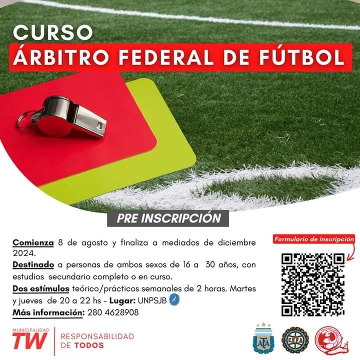 Con el acompañamiento de la Municipalidad de Trelew, gracias a un convenio celebrado oportunamente con la Liga de Fútbol del Valle del Chubut y el Consejo Federal de AFA, desde el 8 de agosto se dictará un curso de árbitro profesional de fútbol.