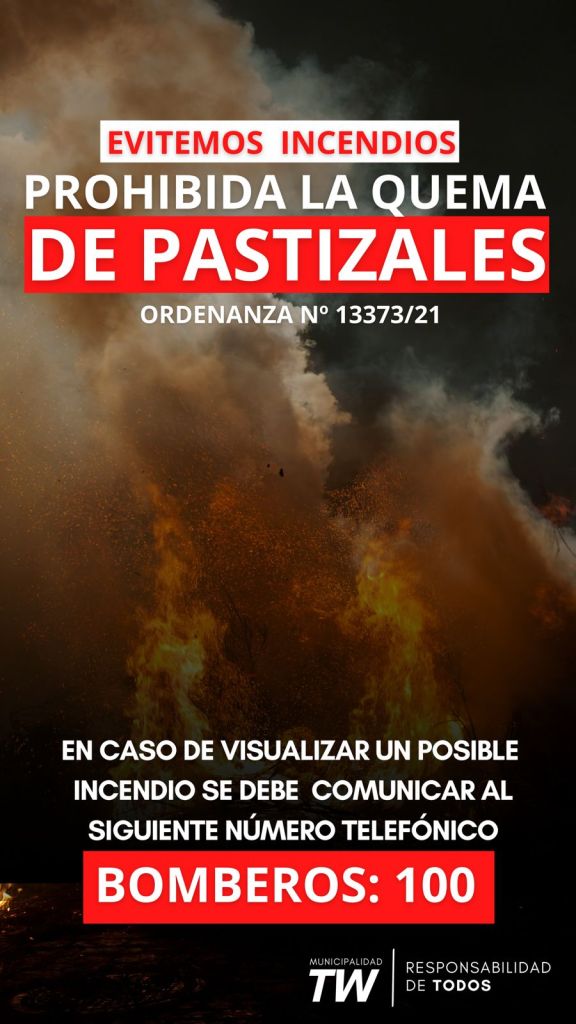 La Municipalidad de Trelew recuerda que, ante los altos índices de riesgos de incendios debido a las altas temperaturas y las condiciones de la zona por la época del año, está prohibida la quema de pastizales, tal cual lo establecido en la normativa vigente.