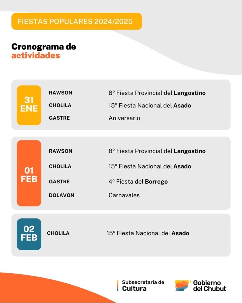 Se trata de la 15º edición de la Fiesta Nacional del Asado en Cholila, la 8º Fiesta del Langostino en Playa Unión, el 121º aniversario de Gastre junto a la 4º edición de la Fiesta del Borrego, además de los tradicionales Carnavales de Dolavon.