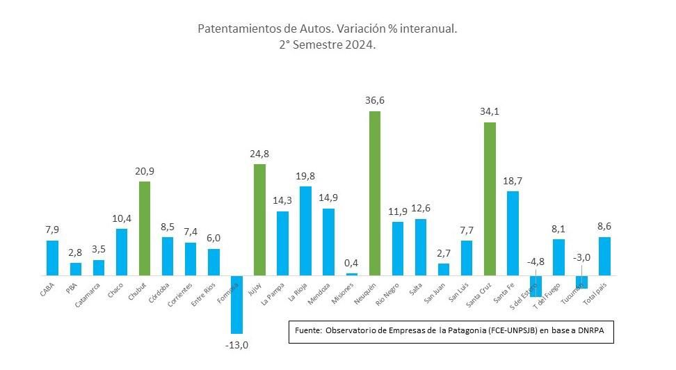 El documento señala que Chubut es una de las cuatro provincias que más creció en ventas de autos cero kilómetro, indicando que «en el segundo semestre de 2024, el crecimiento de la actividad económica exhibió en general fuertes señales de crecimiento, tanto del lado de la demanda como de la oferta».