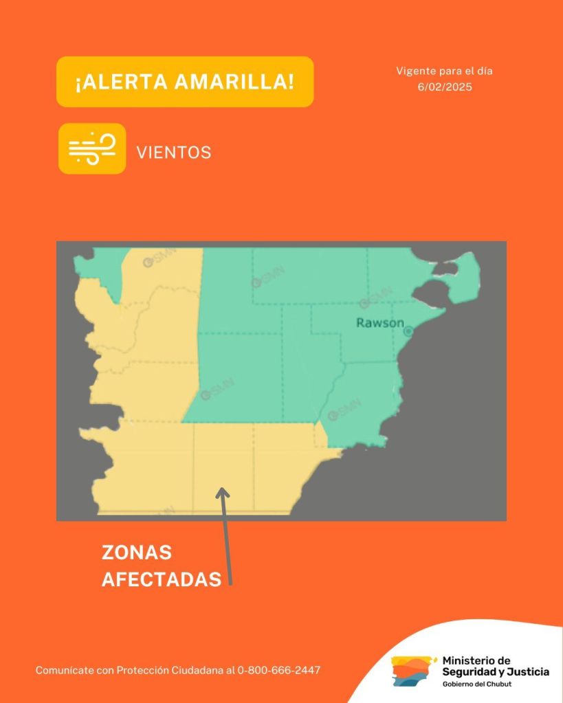 El Ministerio de Seguridad y Justicia del Gobierno del Chubut emitió una alerta amarilla por fuertes vientos para el miércoles 6 de febrero, afectando principalmente el oeste y sur de la provincia.