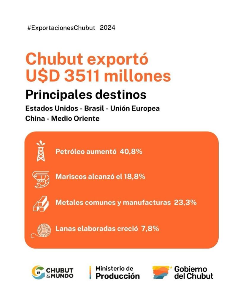 Las exportaciones de Chubut alcanzaron los 3.511 millones de dólares en 2024, reflejando un incremento del 29,9% respecto al año anterior. El gobernador Ignacio «Nacho» Torres destacó el potencial productivo de la provincia y reafirmó el compromiso con el comercio exterior.