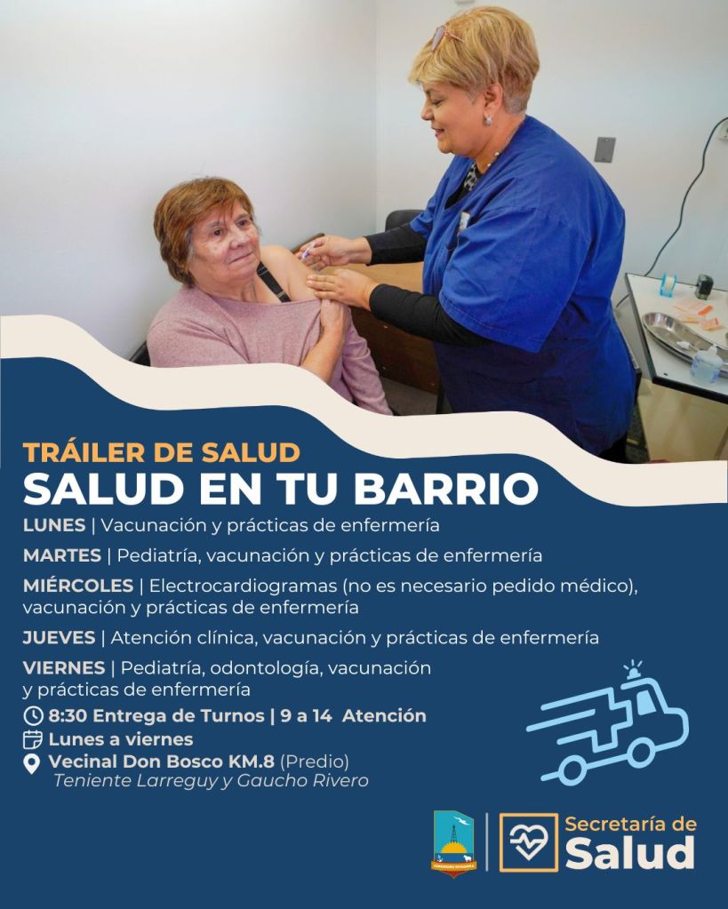 Dando continuidad a las políticas sanitarias que promueve la gestión del intendente Othar Macharashvili, el programa municipal “Salud en tu Barrio”, desde el lunes 17 de marzo, el programa sanitario denominado “Salud en tu barrio” se encuentra establecido en la sede de la Asociación Vecinal del barrio Don Bosco, ubicada en las calles Teniente Larreguy y Gaucho Rivero; asegurando de esta manera, el servicio sanitario para los vecinos de zona norte y todos aquellos que necesiten recibir atención.