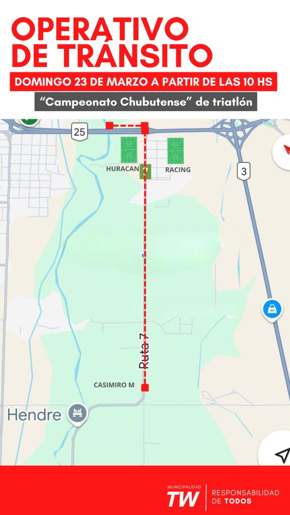 La Municipalidad de Trelew informa que este domingo 23 de marzo, por la mañana, se llevará a cabo un operativo de tránsito en la zona de chacras, debido al desarrollo de una actividad deportiva.