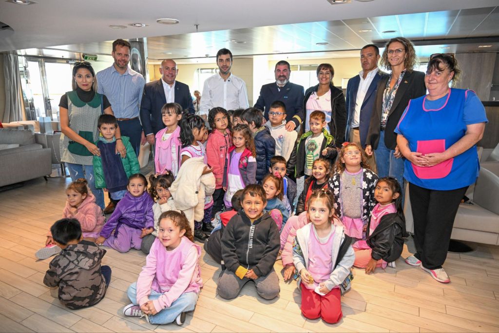 La jornada fue organizada por la agencia marítima Delver como parte del 30° aniversario de la Administración Portuaria de Puerto Madryn (APPM). Durante el recorrido, Torres acompañó a los niños por diferentes sectores del buque de bandera francesa, que arribó el miércoles con 122 pasajeros y 157 tripulantes.