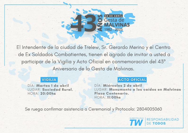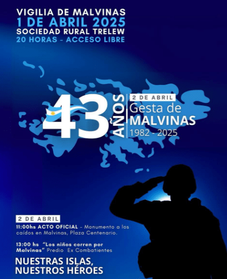 El Municipio de Trelew acompaña el programa que conmemora el 43° aniversario de la gesta de Malvinas, organizado por el Centro de Soldados Ex Combatientes, con actividades que incluyen la vigilia en el predio de la Sociedad Rural y el acto central del 2 de abril en el Monumento a los caídos, en plaza Centenario. Además, se realizará la corrida recreativa «Los niños corren por Malvinas».