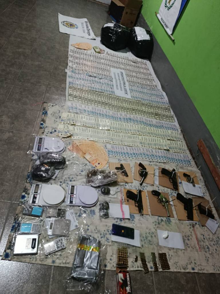 El megaoperativo incluyó 19 allanamientos y la participación de 200 efectivos, con la detención de 8 personas —entre ellas una mujer—. Durante el procedimiento se secuestraron 15 kilos de marihuana, más de un kilo de cocaína, 13 armas de fuego con municiones calibre 9 milímetros, 10 balanzas de precisión, 50 celulares, así como una importante suma de dinero: más de 6 millones de pesos y 6.700 dólares. También se incautaron dos vehículos.