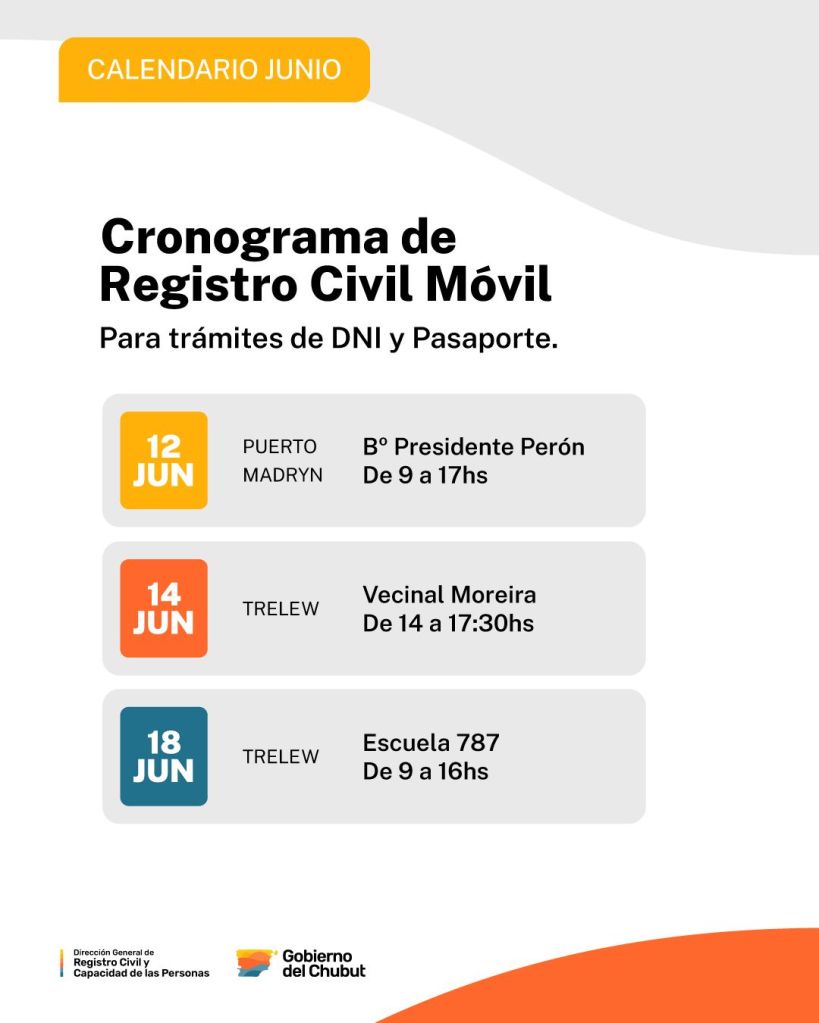 stionar el PasapoEl Gobierno del Chubut, a través del Ministerio de Gobierno y la Dirección General de Registro Civil y Capacidad de las Personas, informa que este jueves 12, sábado 14 y miércoles 18 de junio la Unidad Móvil realizará operativos para tramitar, renovar o actualizar el Documento Nacional de Identidad (DNI) y el Pasaporte en Puerto Madryn y Trelew.