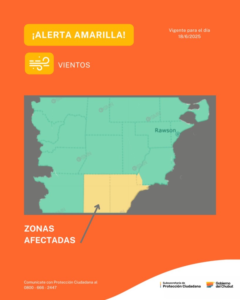 La advertencia climática abarca las siguientes zonas: Meseta de Escalante, Sarmiento, Sudoeste de Florentino Ameghino y Costa de Escalante.