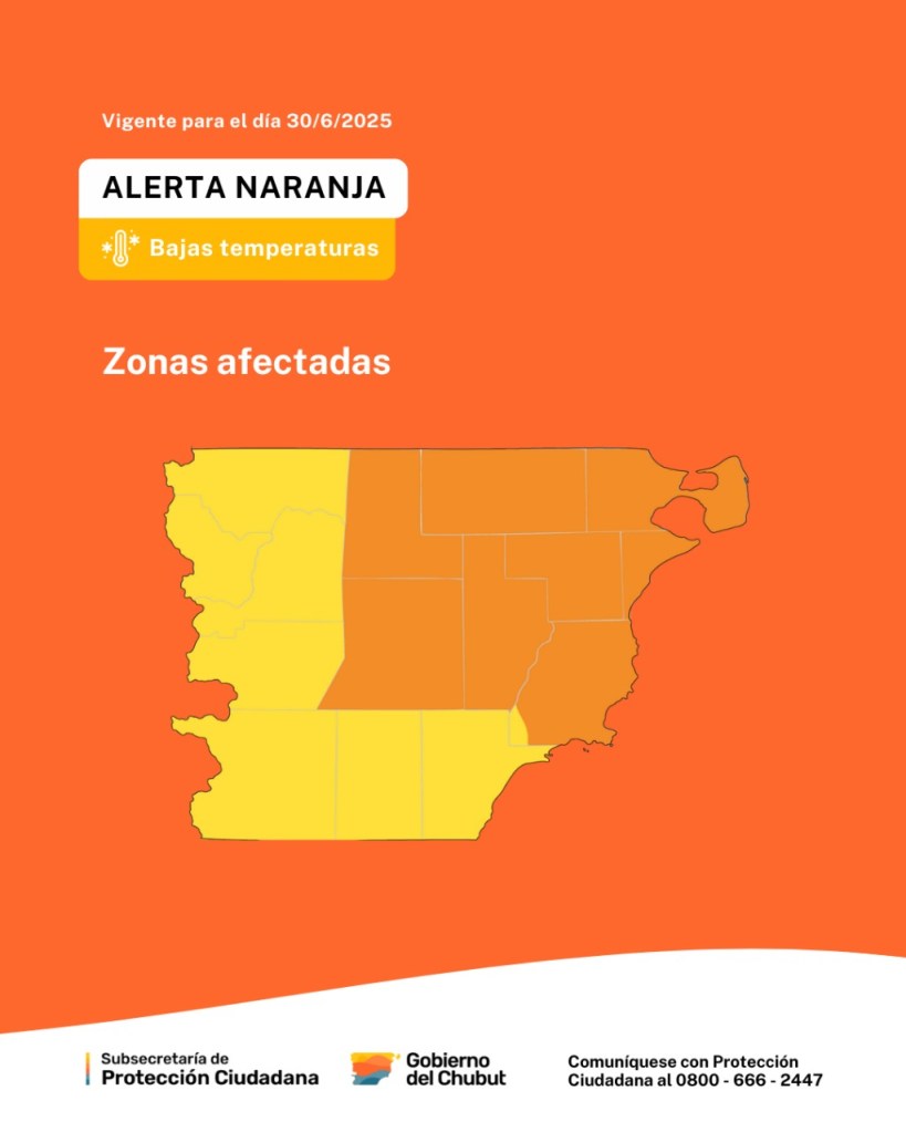 La Subsecretaría de Protección Ciudadana, dependiente del Ministerio de Seguridad y Justicia, comunica el alcance del alerta naranja y amarilla por temperaturas extremas bajas, emitido por el Servicio Meteorológico Nacional, correspondiente al día 30 de junio.