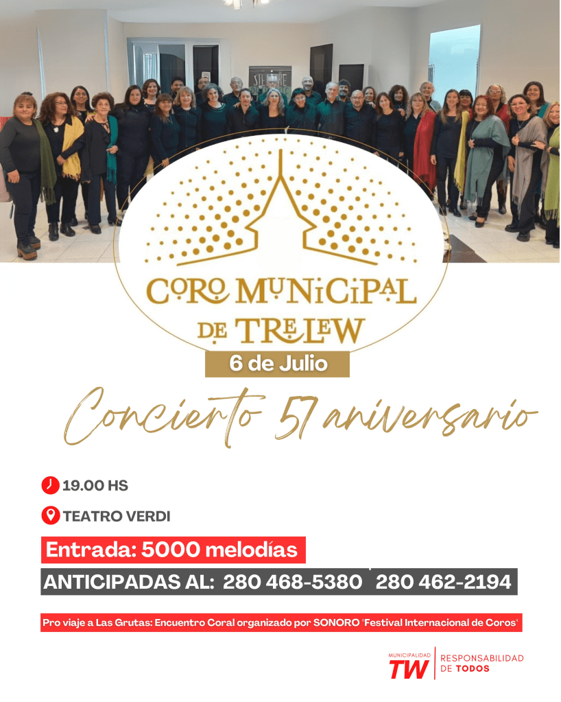En el marco del 57° aniversario del Coro Municipal de Trelew, y con el acompañamiento del Ejecutivo local, la agrupación coral realizará un concierto especial este domingo 6 de julio a las 19 horas, en el tradicional Teatro Verdi de la ciudad.