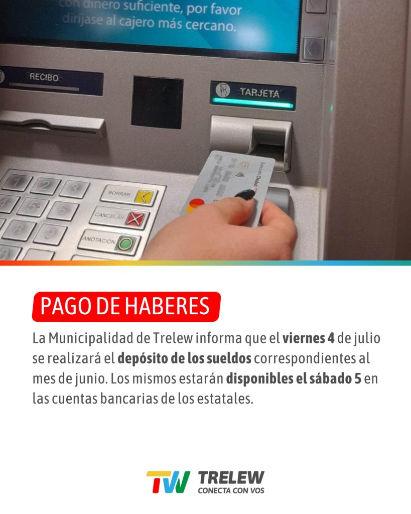 La Municipalidad de Trelew anuncia que el viernes 4 de julio se depositarán los sueldos correspondientes a junio de los empleados públicos de su dependencia.