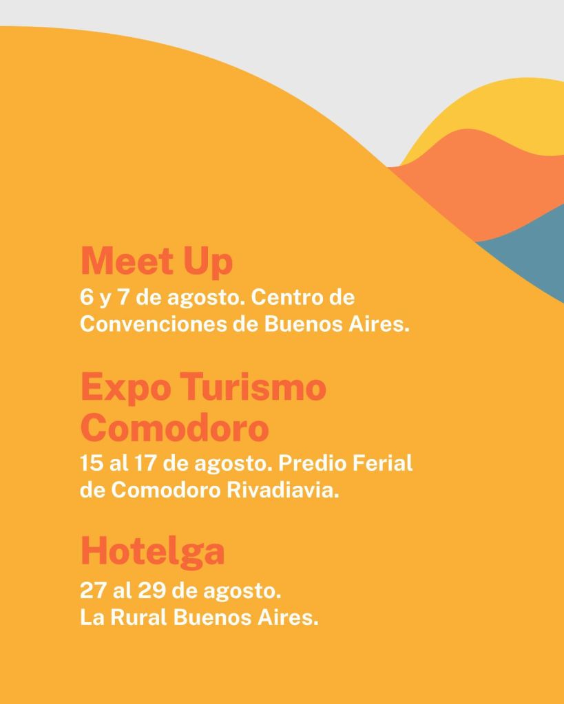 Expo Turismo Comodoro (15 al 17 de agosto, Predio Ferial de Comodoro Rivadavia), con propuestas regionales y del sur provincial.