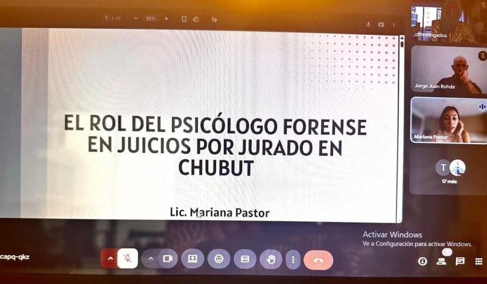 Durante su intervención, la Lic. Pastor explicó en detalle las funciones específicas del psicólogo forense, haciendo hincapié en su intervención en causas penales con juicio por jurados, modalidad que se encuentra vigente en la provincia del Chubut.