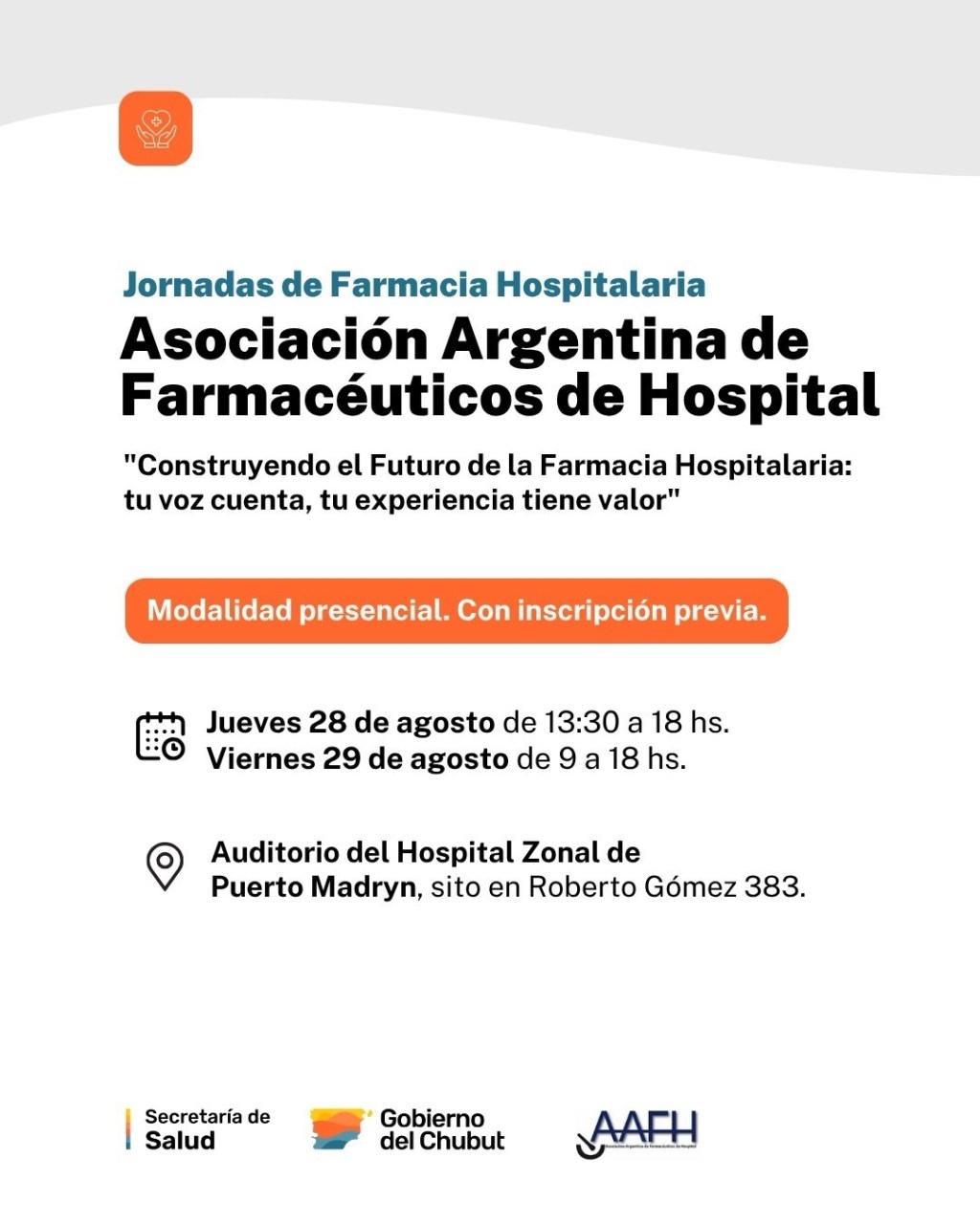 Con el acompañamiento del Gobierno del Chubut, a través de la Secretaría de Salud provincial, se realizarán en Puerto Madryn las “1° Jornadas Patagónicas de Farmacia Hospitalaria”, organizadas por la Asociación Argentina de Farmacéuticos de Hospital (AAFH). La cita será los días 28 y 29 de agosto, de forma presencial, en el Hospital Zonal “Dr. Andrés Ísola”.
