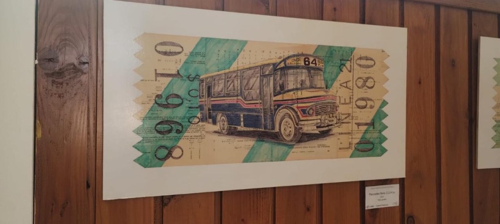 La muestra reúne dibujos de vehículos emblemáticos de la industria automotriz argentina, ilustrados sobre soportes que imitan boletos de colectivo —una invención nacional que aporta contexto y sentido histórico a cada pieza.