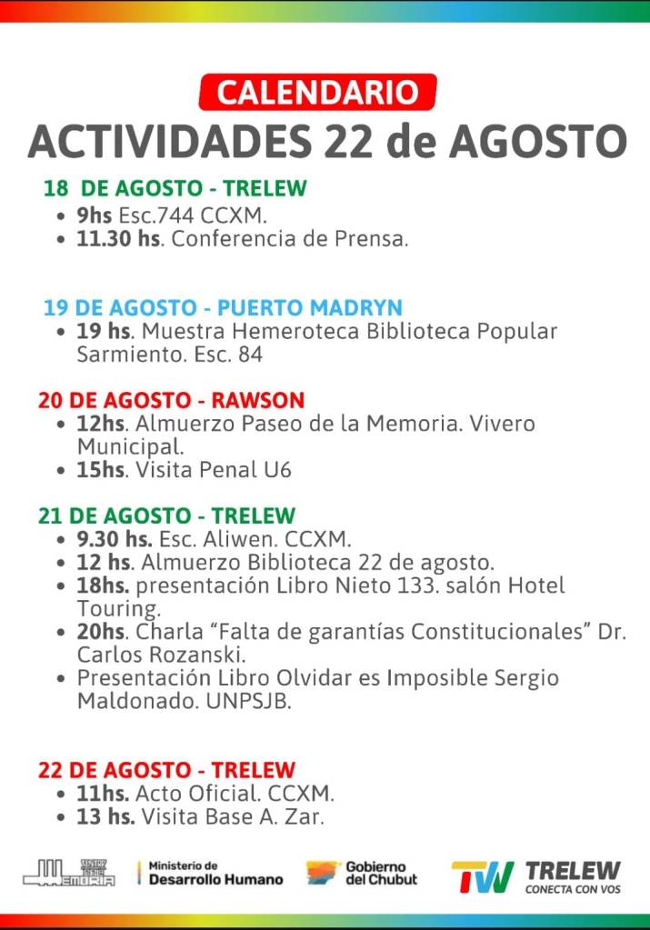 La Semana de la Memoria incluirá charlas en escuelas, presentaciones de libros, muestras en Puerto Madryn y Rawson, la visita al Penal U6, y el acto central del viernes 22 en el Centro Cultural por la Memoria, seguido de una recorrida por la Base Aeronaval Almirante Zar.