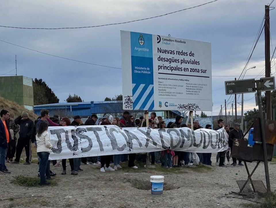 La concentración se realizó en la intersección de Chile y Constituyentes, frente al cartel que anuncia la obra de desagües pluviales que nunca se ejecutó, pese a los anticipos millonarios abonados. Con una bandera que rezaba “Justicia por Comodoro”, los manifestantes denunciaron el abandono de los proyectos destinados a prevenir nuevas inundaciones.