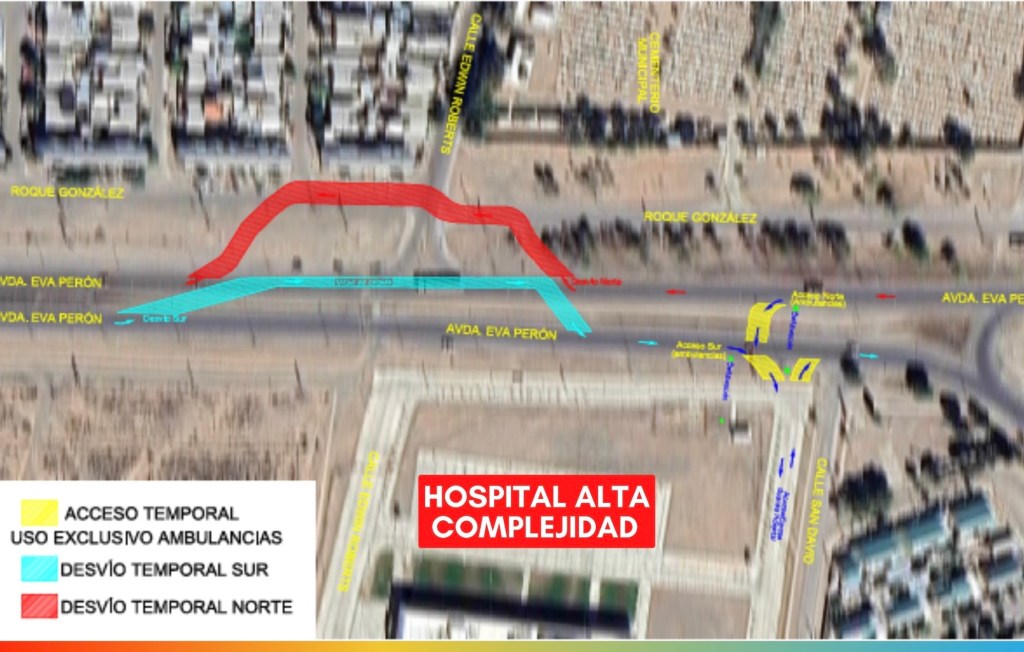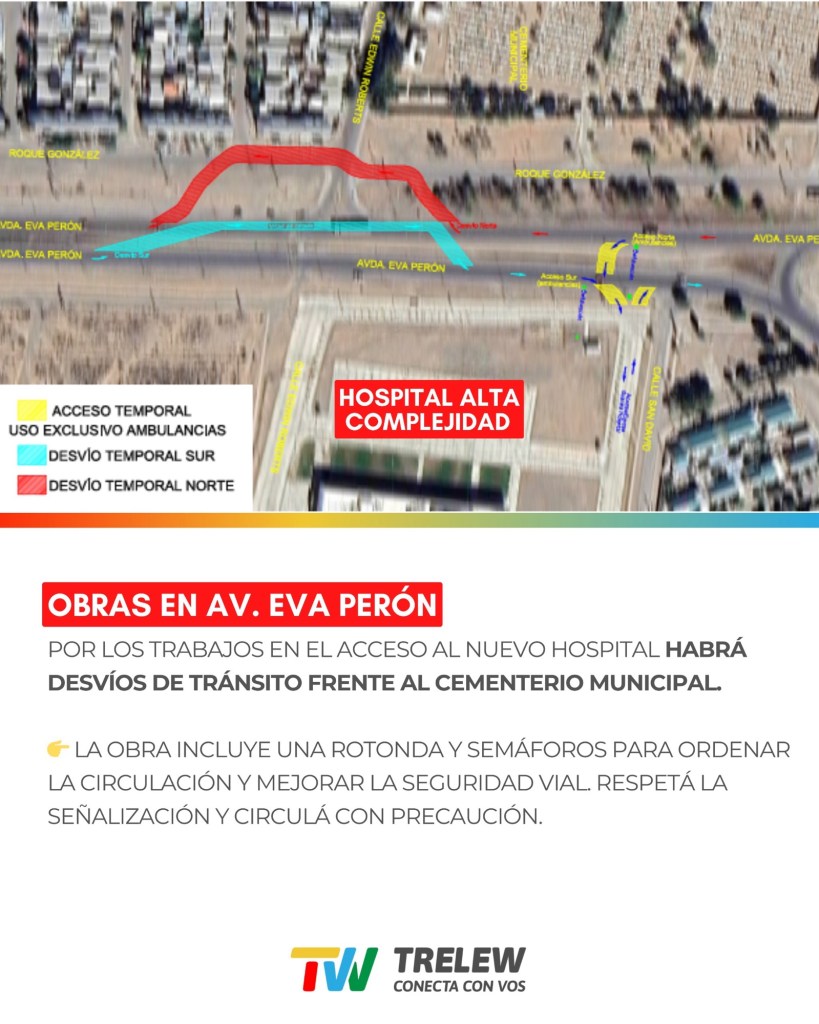 La Municipalidad de Trelew informó que, debido a las obras en el acceso principal al Hospital de Alta Complejidad “María Humphreys”, habrá desvíos en la circulación vehicular sobre la avenida Eva Perón, frente al cementerio municipal, durante aproximadamente tres meses.
