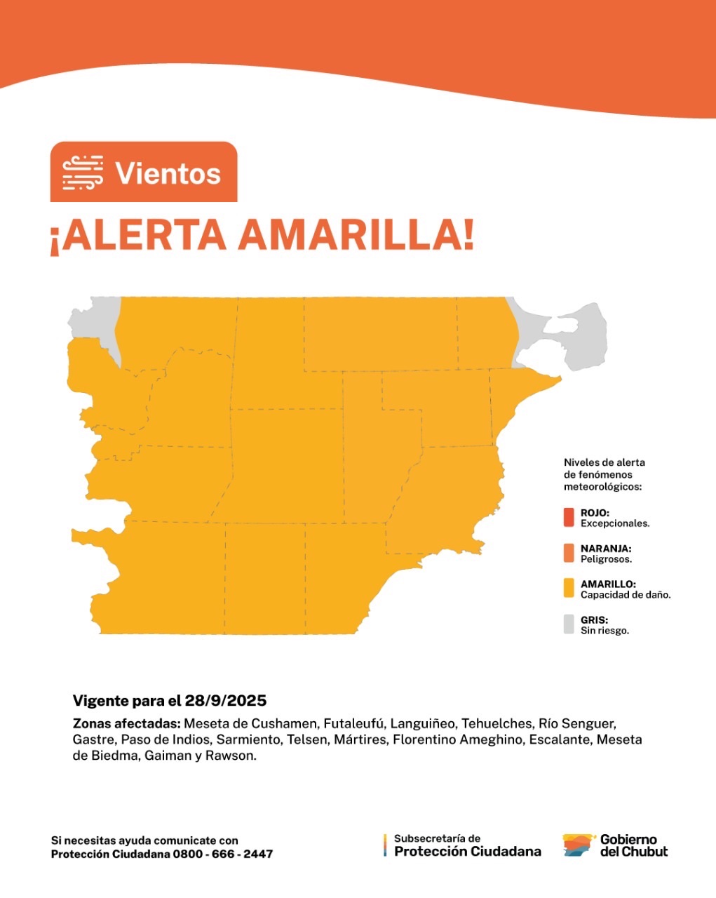 En tanto, el domingo 28 de septiembre la alerta se amplía y alcanza a casi toda la provincia, sumando a las zonas anteriormente mencionadas a los departamentos de Meseta de Biedma, Gaiman y Rawson.