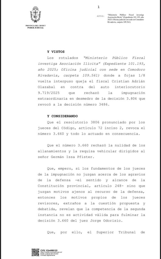 El Superior Tribunal de Justicia del Chubut rechazó por unanimidad la nulidad de los allanamientos en la causa que investiga al ex secretario de Hacienda de Comodoro Rivadavia, Germán Issa Pfister, por presuntas irregularidades en el manejo de fondos públicos durante el temporal de 2017.