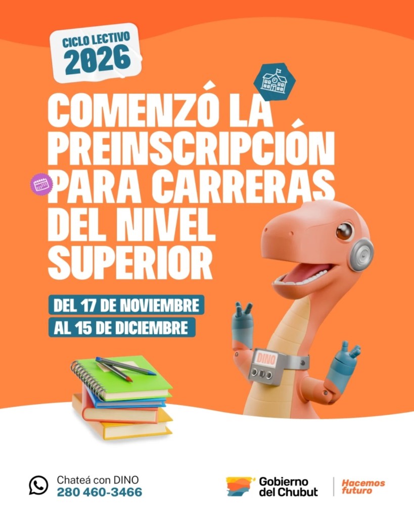 El Gobierno del Chubut informó la apertura del período de preinscripción a las carreras de los Institutos Superiores de Formación Docente (ISFD), disponible hasta el 15 de diciembre a través de DINO (280 460-3466).