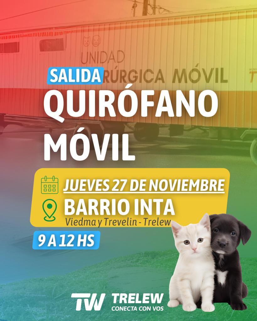La Municipalidad de Trelew continuará este jueves 27 de noviembre, de 9 a 12, con la campaña barrial de salud animal, acercando el quirófano móvil de Zoonosis al cruce de Viedma y Trevelin, en el barrio INTA, para realizar castraciones gratuitas de perros y gatos.