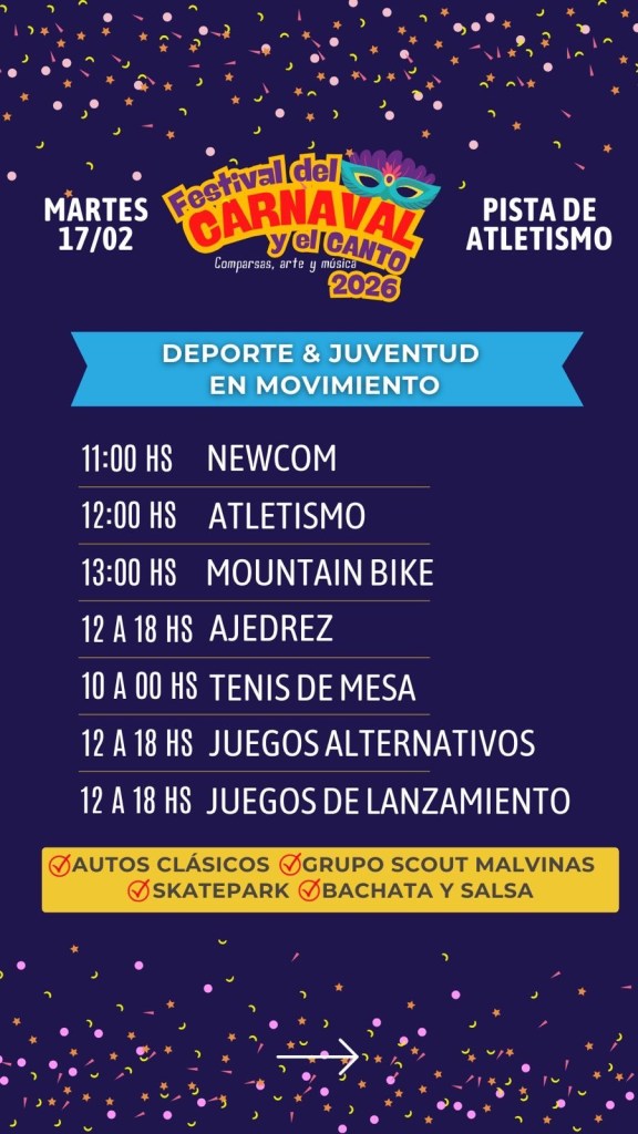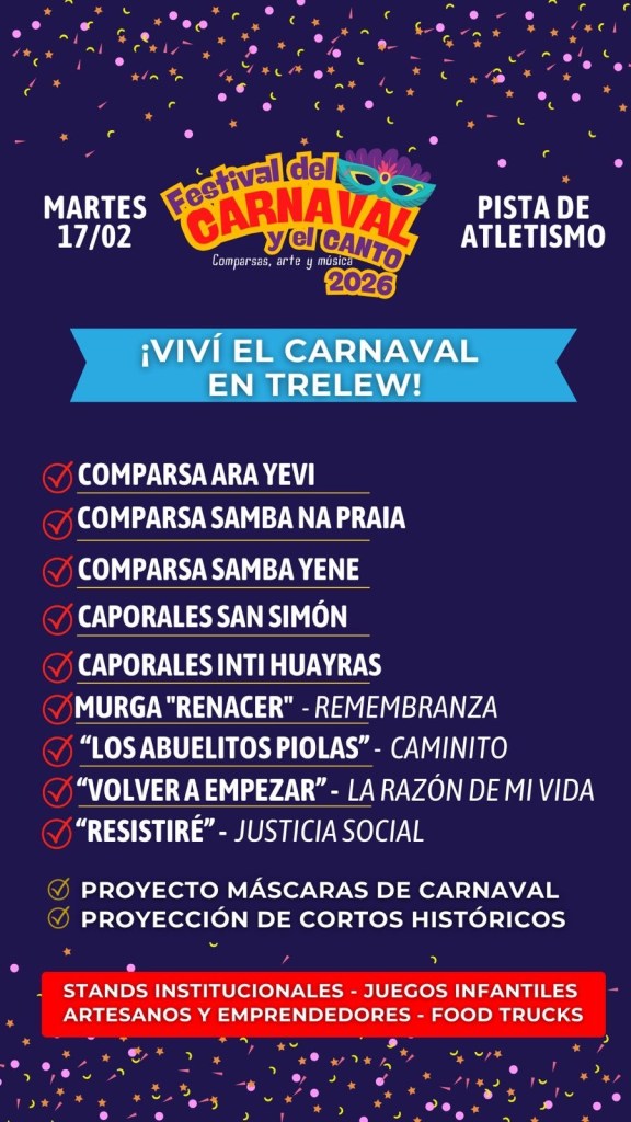La 3º edición del Festival del Carnaval y el Canto se llevará adelante este martes en la Pista Municipal de Atletismo de Trelew, organizada por la Municipalidad local con acompañamiento del sector privado, en una propuesta que busca sostener y fortalecer esta celebración popular en la ciudad.