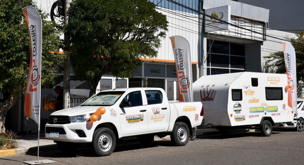 El presidente de Lotería del Chubut, Ramiro Ibarra, junto al gerente general Daniel Cambón Rubí, entregaron una Toyota Hilux y una casilla rodante para cuatro personas a Franco Chiaradia, ganador del Super Telebingo de fin de año.